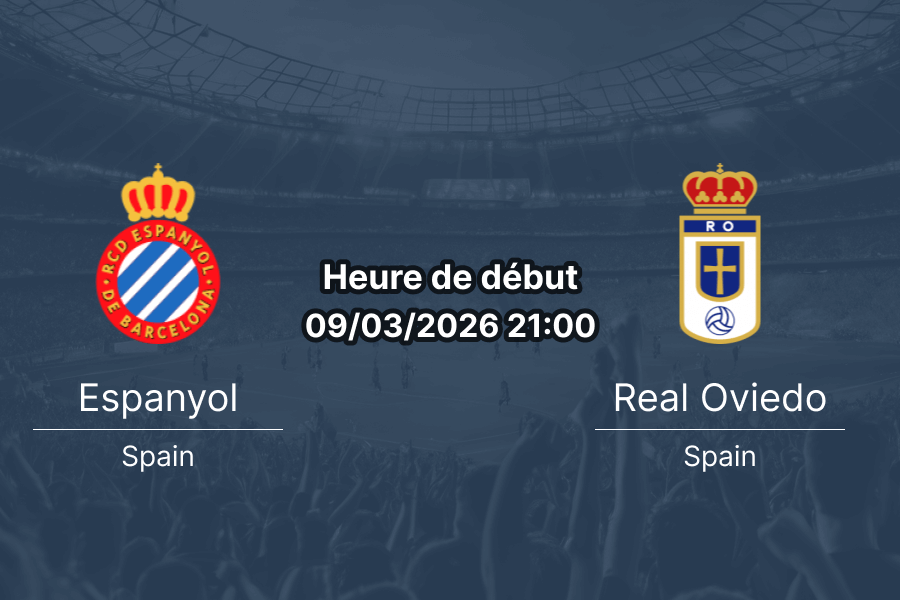 Lundi 9 mars 2026, 21h00 — RCDE Stadium, Barcelone. La 27e journée de La Liga oppose l’RCD Espanyol (7e, 36 pts, 10V-6N-10D) au Real Oviedo (20e et dernier, 17 pts, 3V-8N-15D) dans un match ultra-déséquilibré entre un Espanyol en course pour l’Europe et le lanterne rouge du championnat espagnol. Real Oviedo est la pire équipe de La Liga : 20e sur 20 avec seulement 3 victoires en 26 matchs (12%), 0,62 but/match, 1,65 encaissé/match et une forme extérieure catastrophique (1V-3N-9D, 0,85 but/match, 2,23 encaissé/match — 69% de défaites et 0 clean sheet en 13 déplacements). Espanyol est 7e avec 36 pts — un écart de 19 points. Les cotes : Espanyol ~1.95-2.00, nul ~3.25-3.40, Oviedo ~3.25-4.30.